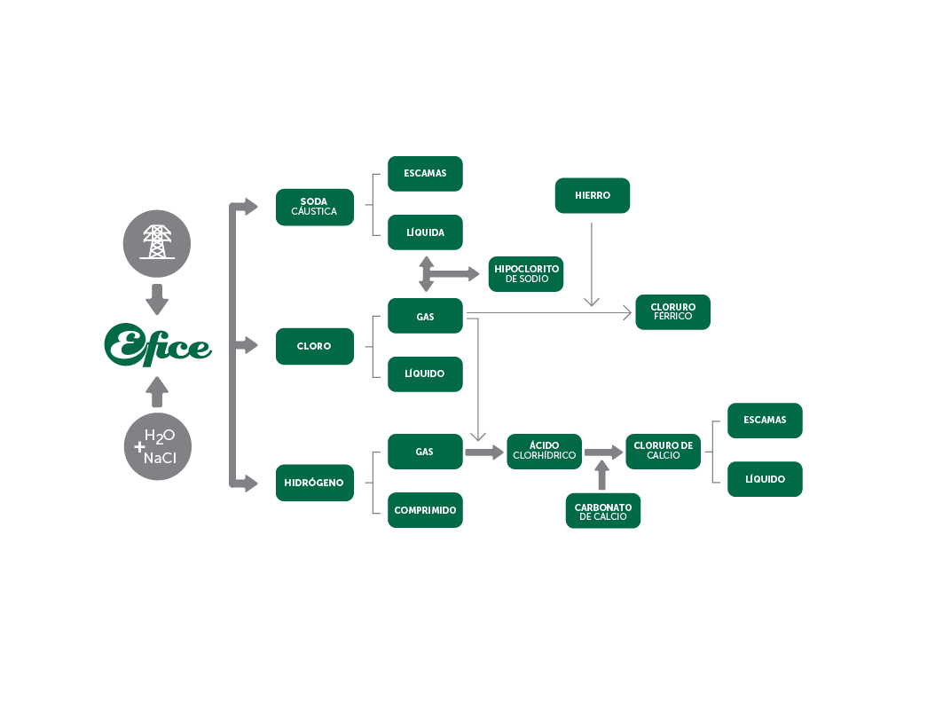 The rest of the products we manufacture come about as a consequence of combinations or the later processing of those primary products in reactions carried out in another 8 production plants connected to the core process, obtaining: caustic soda in flakes, liquid chlorine, compressed gaseous hydrogen, hydrochloric acid solution, sodium hypochlorite, calcium chloride -both liquid and in flakes-, ferric chloride solution and Roadtec.